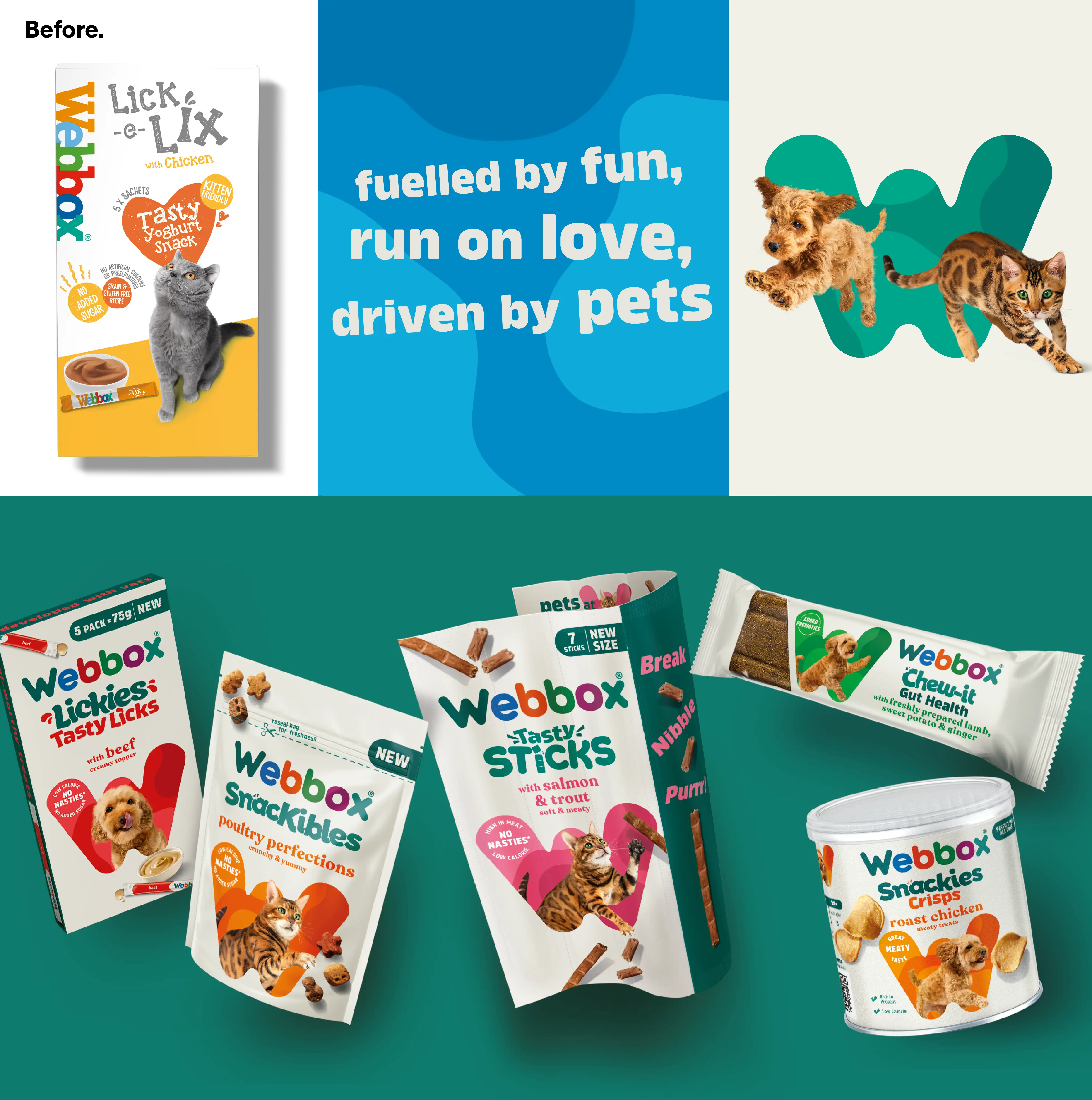 We kicked things off with a full strategy workshop where we clarified Webbox’s values, tone of voice, and market position. Out of that came a new brand idea: “Fuelled by fun, run on love, driven by pets.” This positioning became the foundation for everything that followed, from design principles to packaging systems.