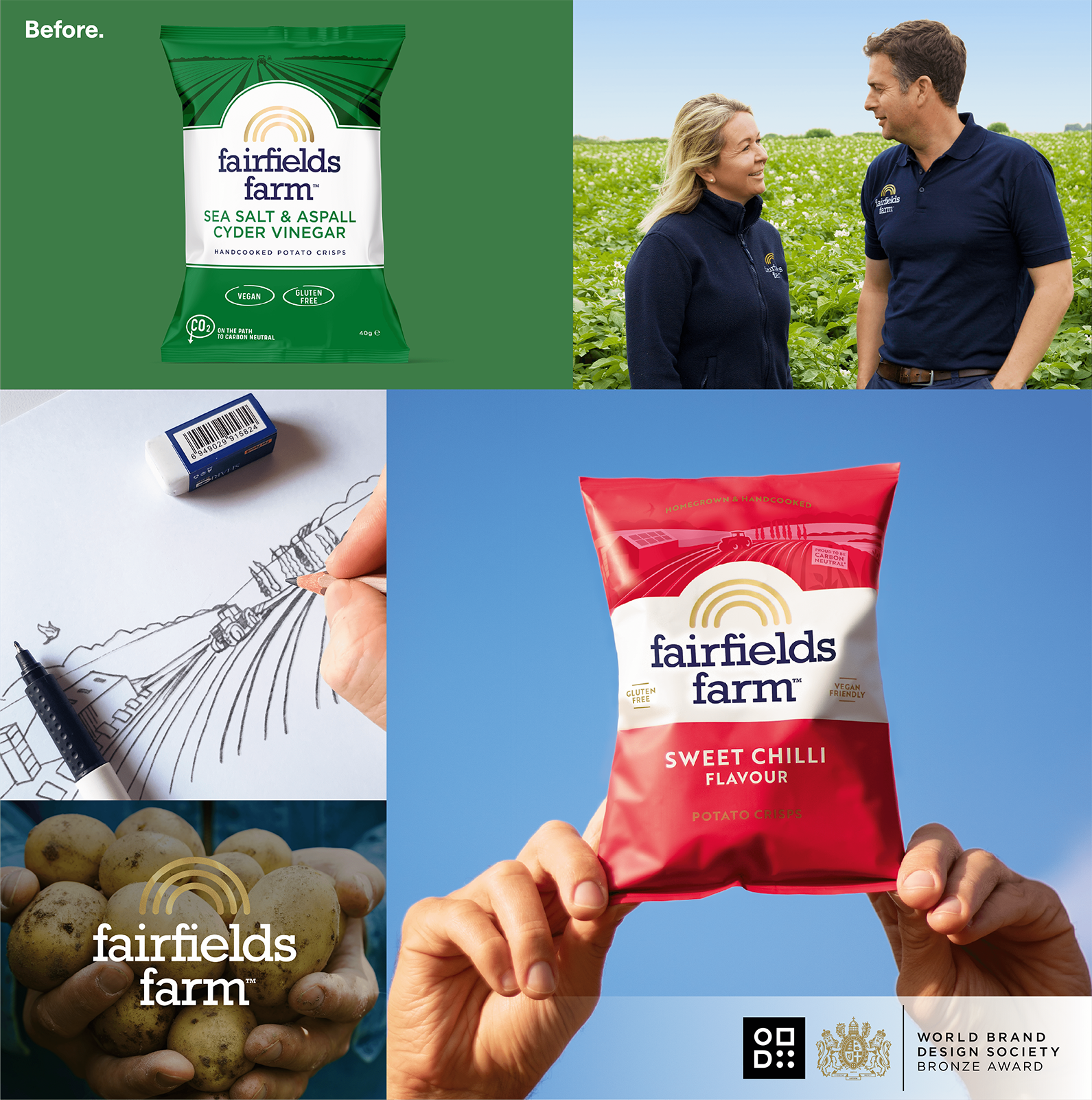 Fairfields Farm had built a loyal following for its hand-cooked crisps – grown, cooked and packed on its family farm. As demand grew, so did ambition. They needed an identity that could reflect their sustainability story and homegrown values, while helping them stand apart in more considered settings like cafés, farm shops and delis.