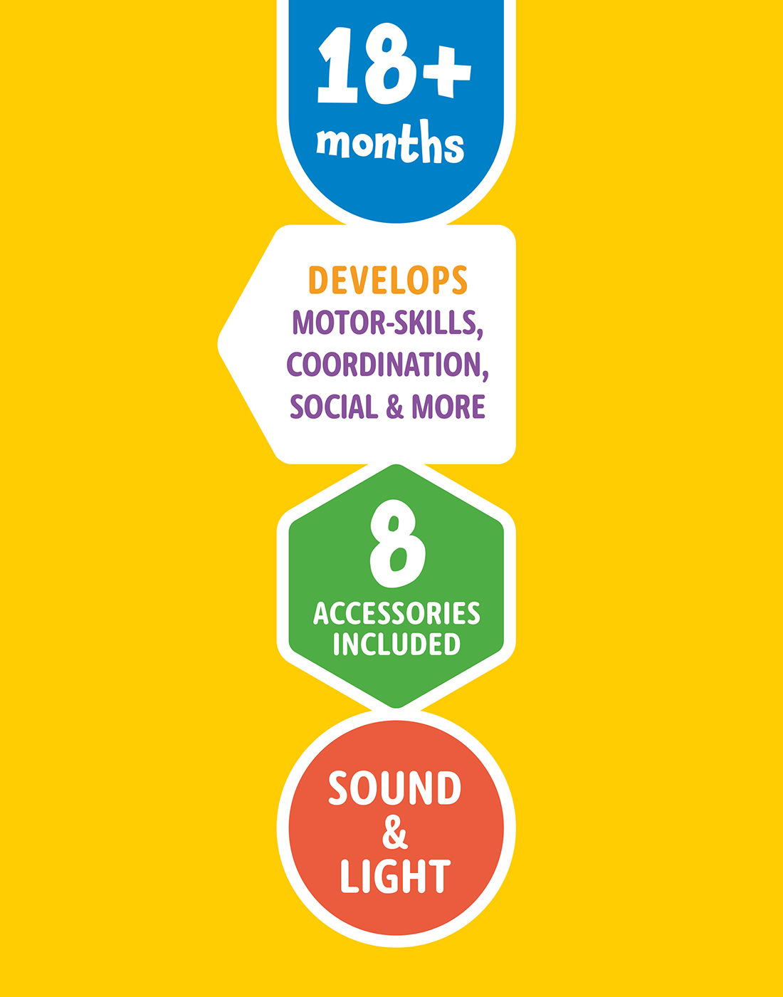 Our fun and colourful brand identity is inspired from building blocks, which in turn build the brand's foundations in shaping development through play. Our warm primary colour palette combined with the geometric ‘blocks’ of the logo create a modern playful identity. These ‘blocks’ are used to create age and range appropriate patterns, graphical elements and characters across multiple categories.